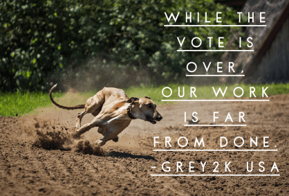 We are thankful for the hard work of our volunteers, who have made many sacrifices in order to give these gentle dogs a voice. We are also grateful for the overwhelming support we have received from editorial boards, Attorney General Pam Bondi, Senator Tom Lee, Representative Carlos Guillermo Smith, Andrew Gillum, Lara Trump, Mike Hill, Governor Rick Scott, Mike Huckabee, U.S. Rep. Matt Gaetz, the Democratic Progressive Caucus of Florida, the Florida Federation of Republican Women, and so many others. We would to thank all of our endorsers and the four sponsors of Amendment 13: GREY2K USA Worldwide, the Humane Society of the United States, the Doris Day Animal League and Animal Wellness Action. In the coming days we will reach out to the greyhound industry as the adoption process begins. Greyhounds make wonderful companions, and this is an opportunity to help thousands of dogs find loving homes. While the vote is over, our work is far from done.”