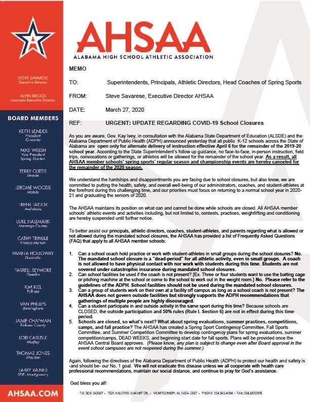 When that decision was announced, it was only a matter of time before the Alabama High School Athletic Association made its own announcement. It came in an email Friday. All spring sports have been canceled. What a gut punch for thousands of student-athletes statewide. Executive Director Steve Savarese released a lengthy statement about the decision.
