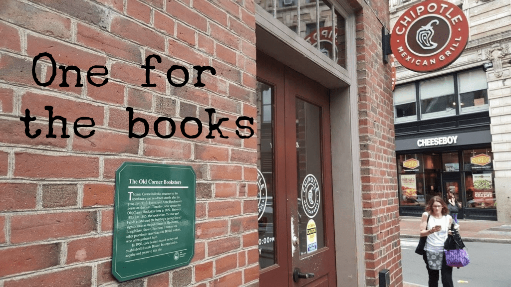 Now that my interest in the classics, in the words of Thoreau and Emerson — and the history of Boston — has strengthened in the five years since I first visited Beantown, I’d love to head north back to Washington Street, to take in that Old Corner Bookstore history. I guess I’ll order the chicken burrito.