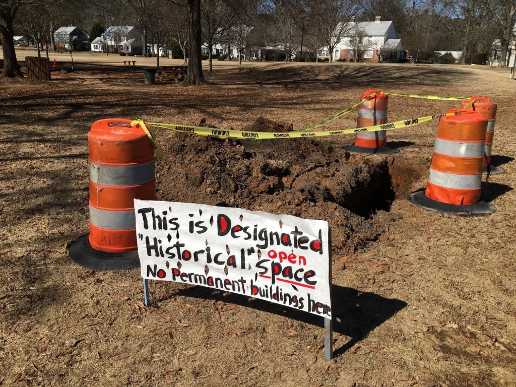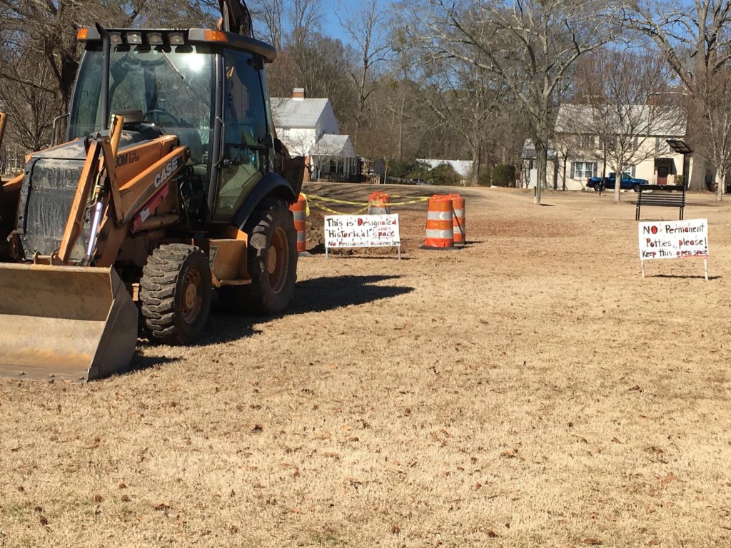 On Feb. 13, percolation tests began on The Mall near the pavilion and pickleball courts. That same day, several protest signs were placed near orange cones that were marking areas that were dug up for percolation testing for a potential septic system. Since that time, fencing has been placed around the area where the restrooms will be constructed.