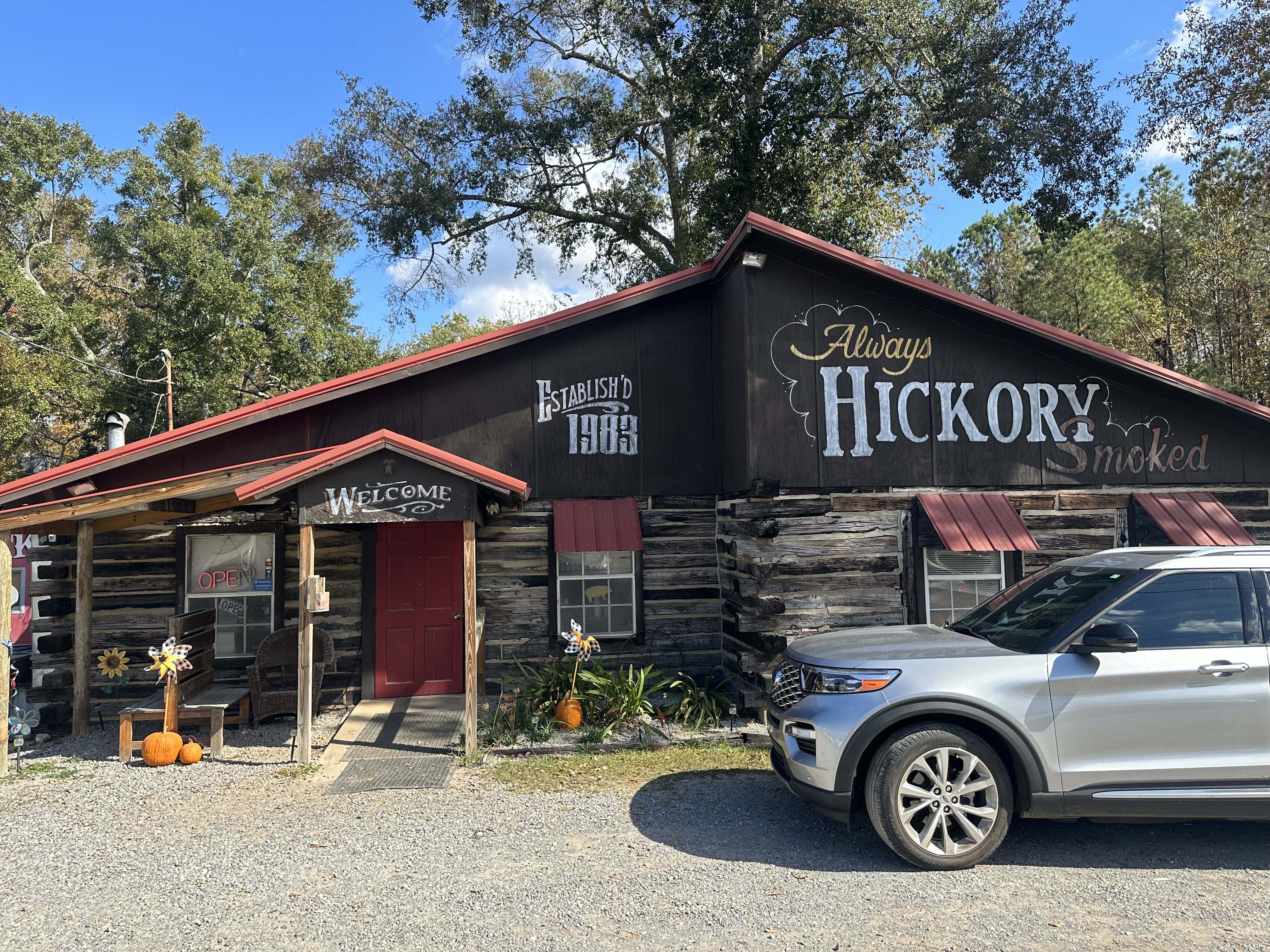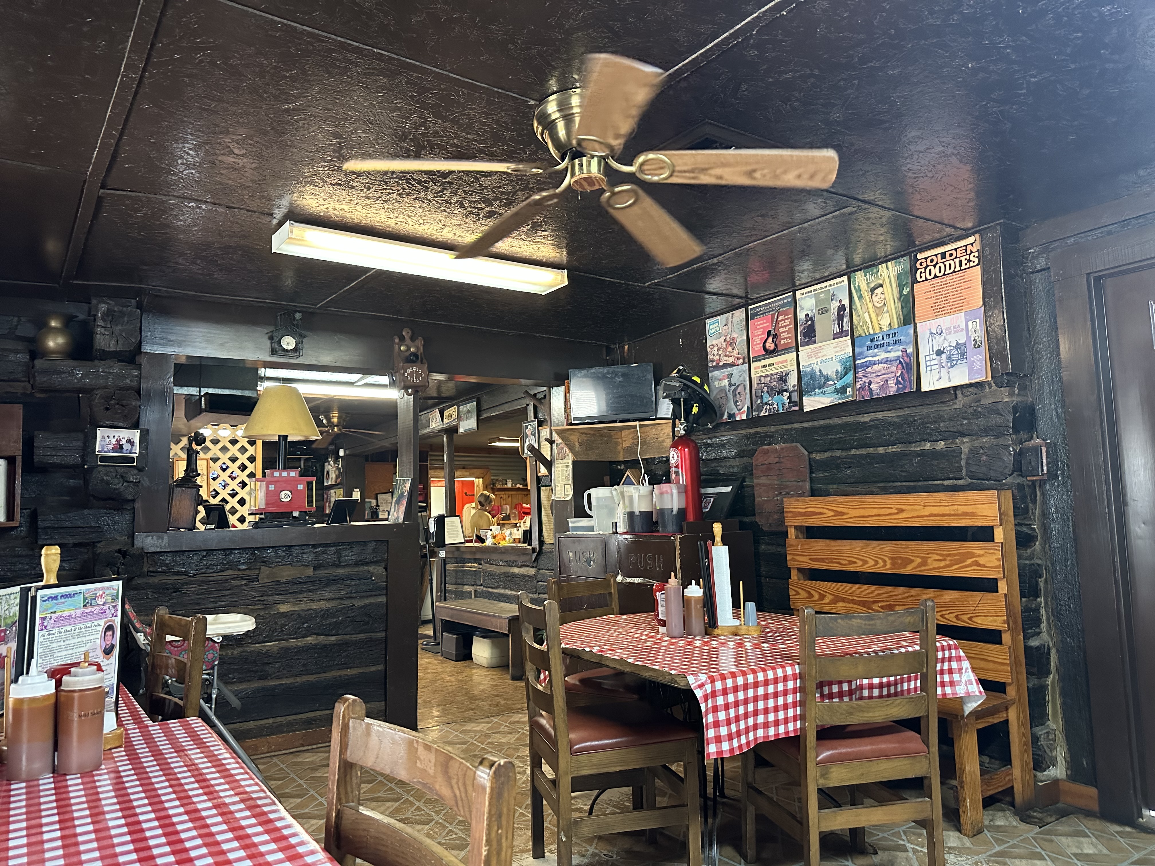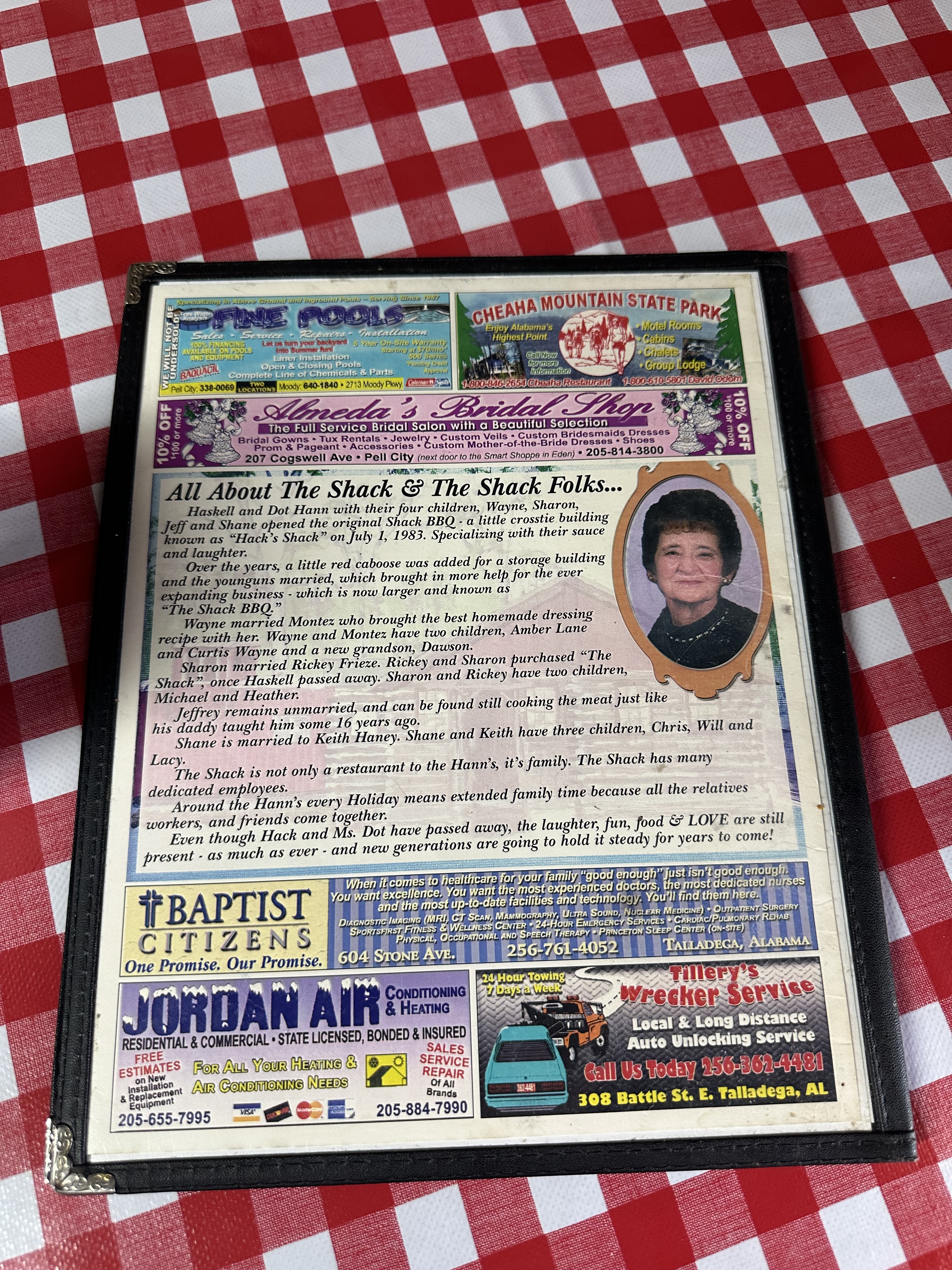 The story of The Shack, and its “folks,” are printed over the course of a few paragraphs. A photo of Dot Hann, one of the original owners, adjoins it. The Shack opened July 1, 1983, and it’s been sitting on that gravel since. Haskell Hann, Dot’s husband, built it, and their home behind it, with railroad crossties. Imagine the best house you’ve made from Lincoln Logs as a kid, but inside there’s a plate of ribs and banana pudding. That’s The Shack.
