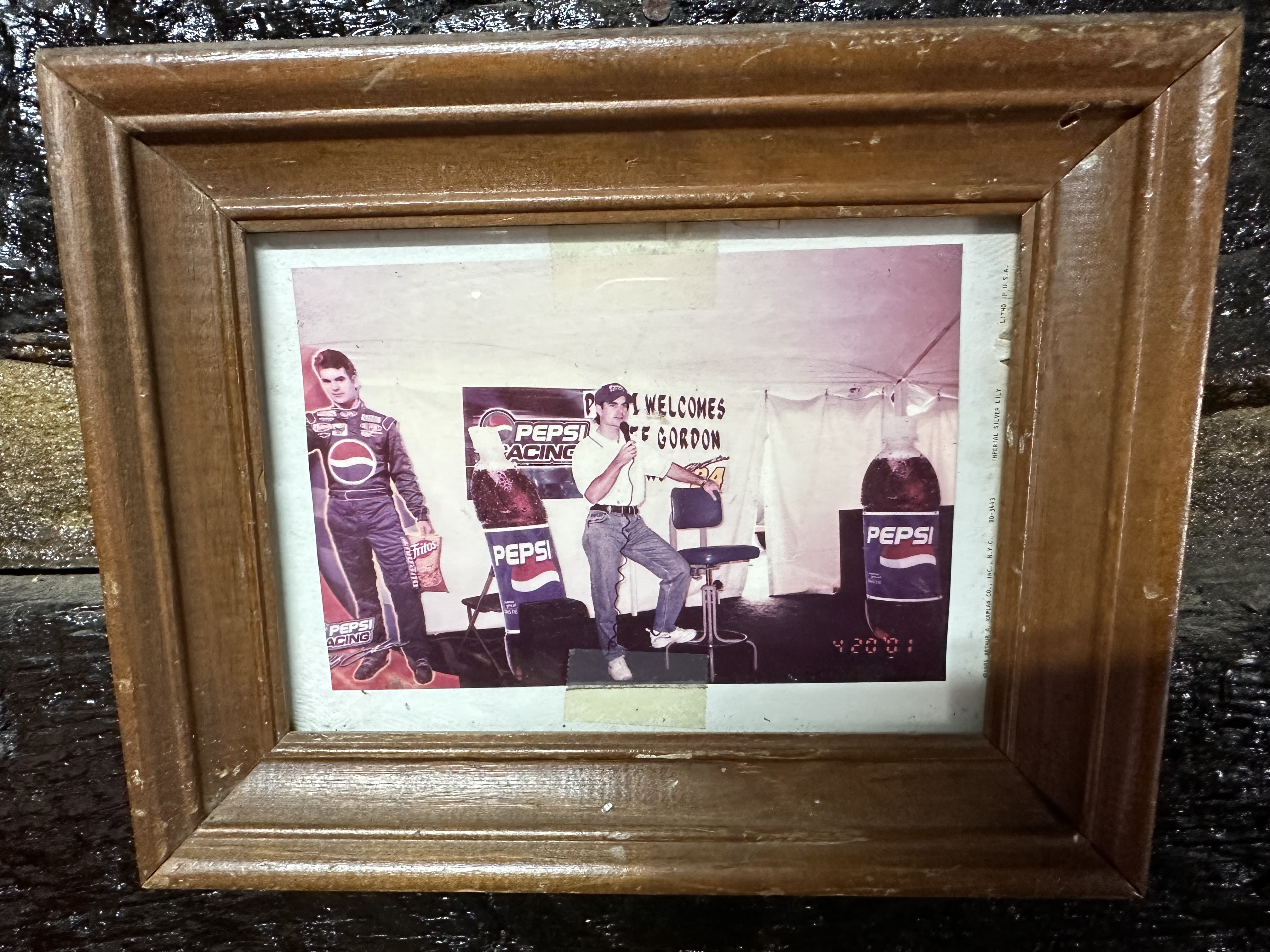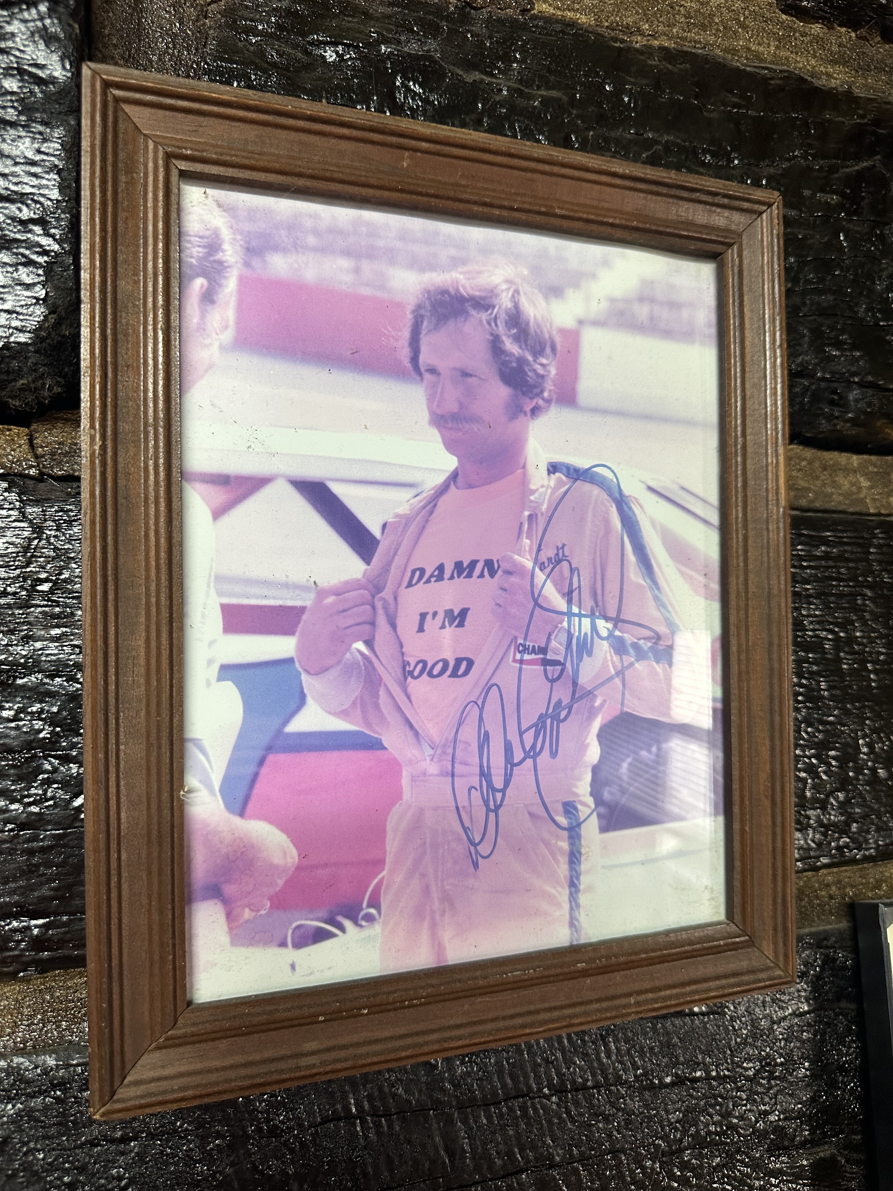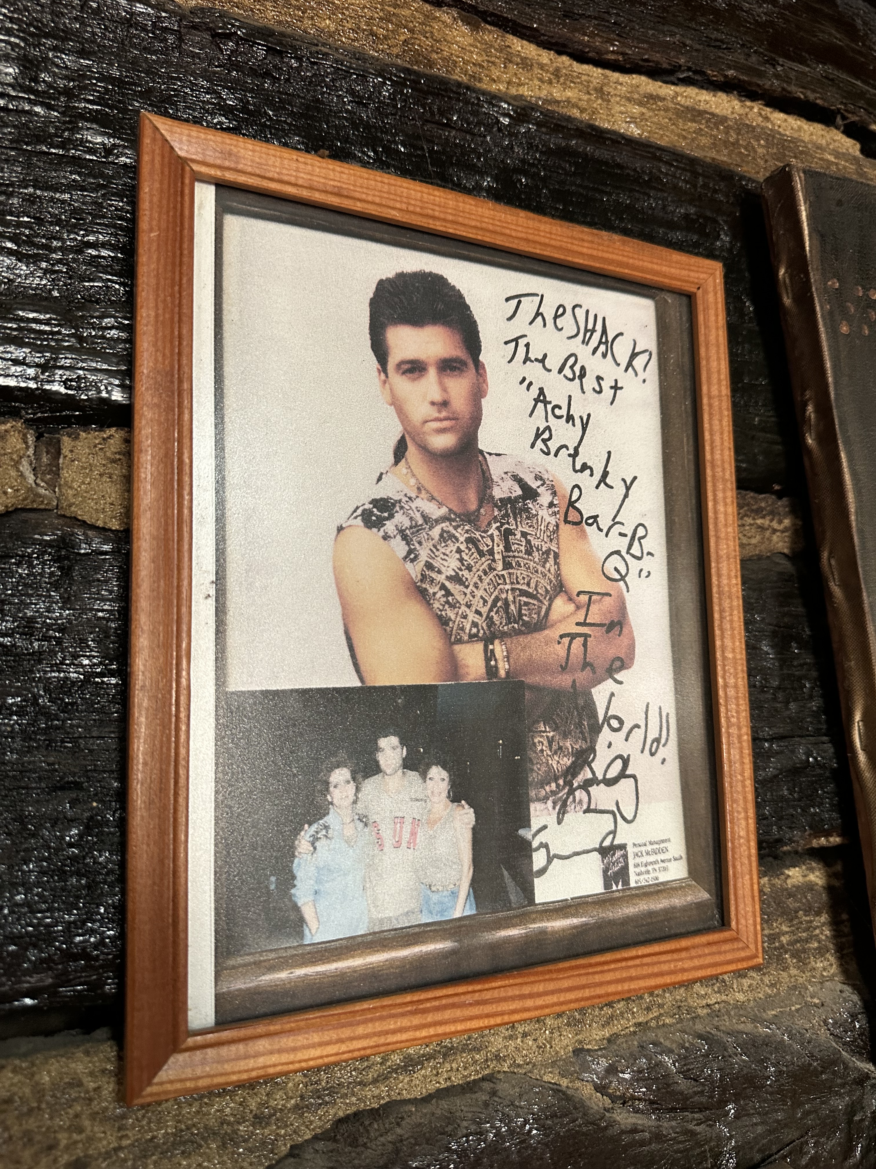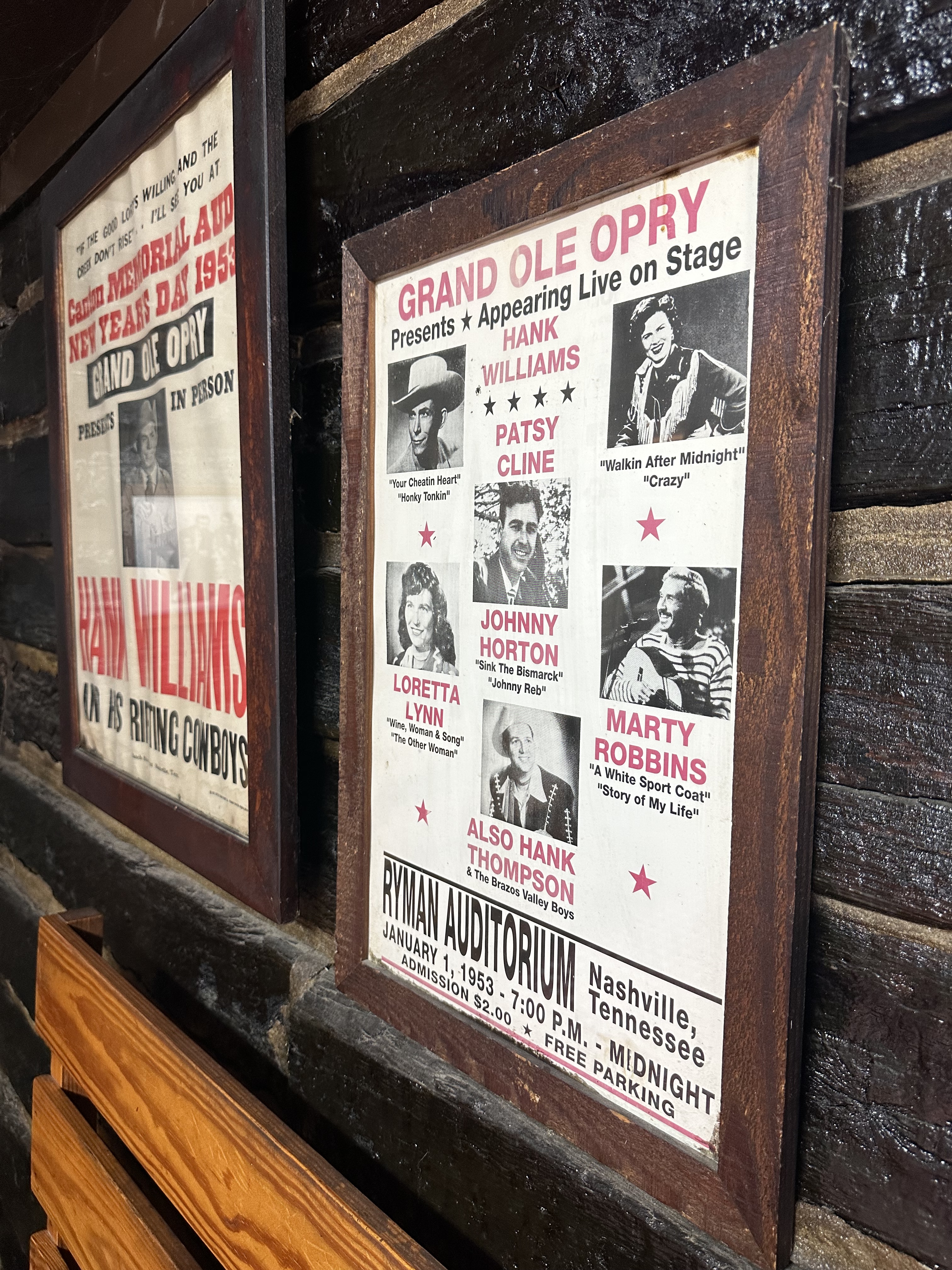 When we got to our back-corner booth, my skepticism vanished without ever having to taste the food. Autographed photos and memorabilia hung from the walls. Dale Earnhardt. Jeff Gordon. Billy Ray Cyrus. A poster from Jan. 1, 1953, that showed a two-dollar entry fee at the Grand Ole Opry to see Hank Williams, Patsy Cline, Loretta Lynn, Johnny Horton, Marty Robbins, and Hank Thompson play their music. The tablecloths were checkered in red and white.