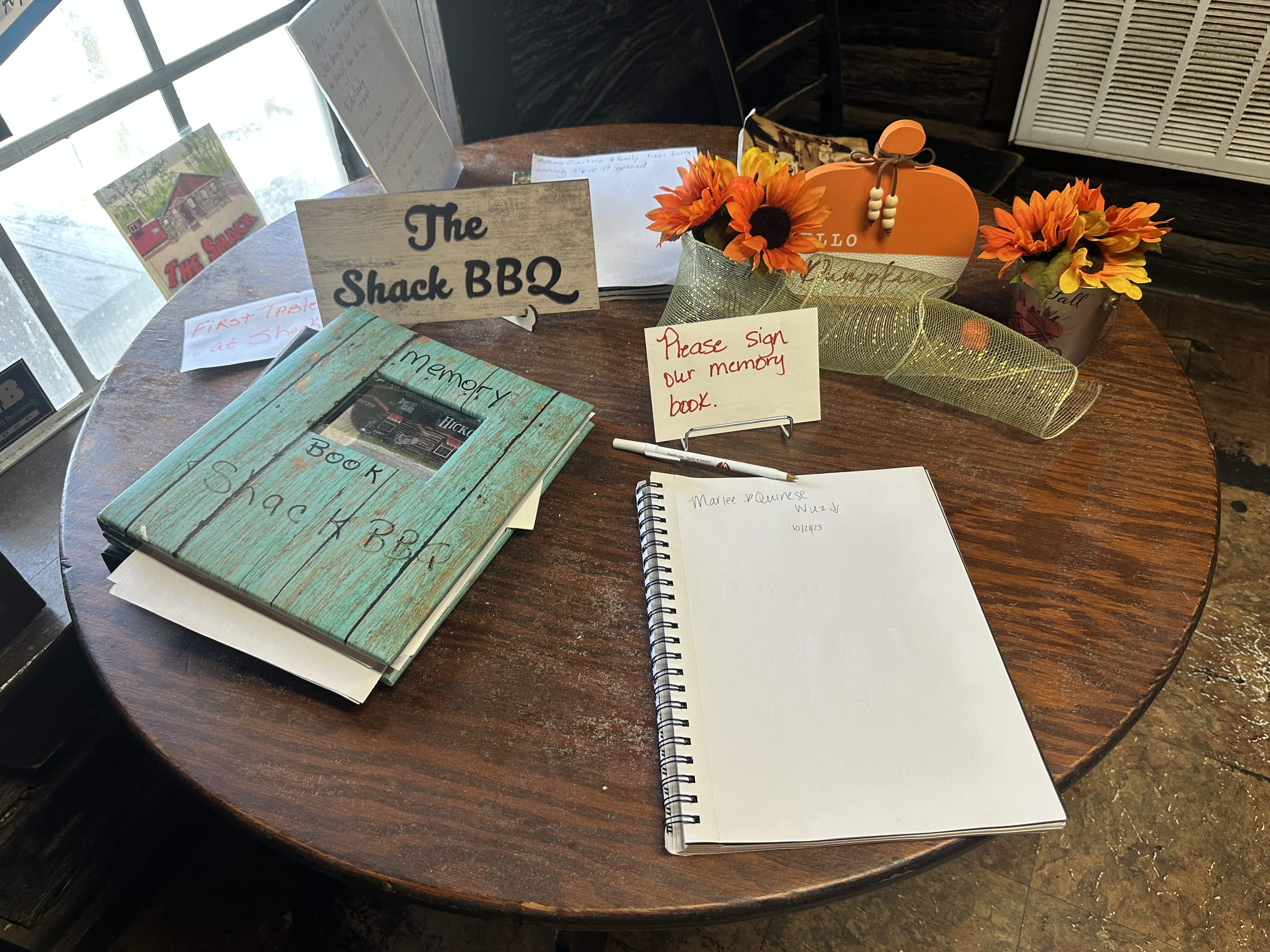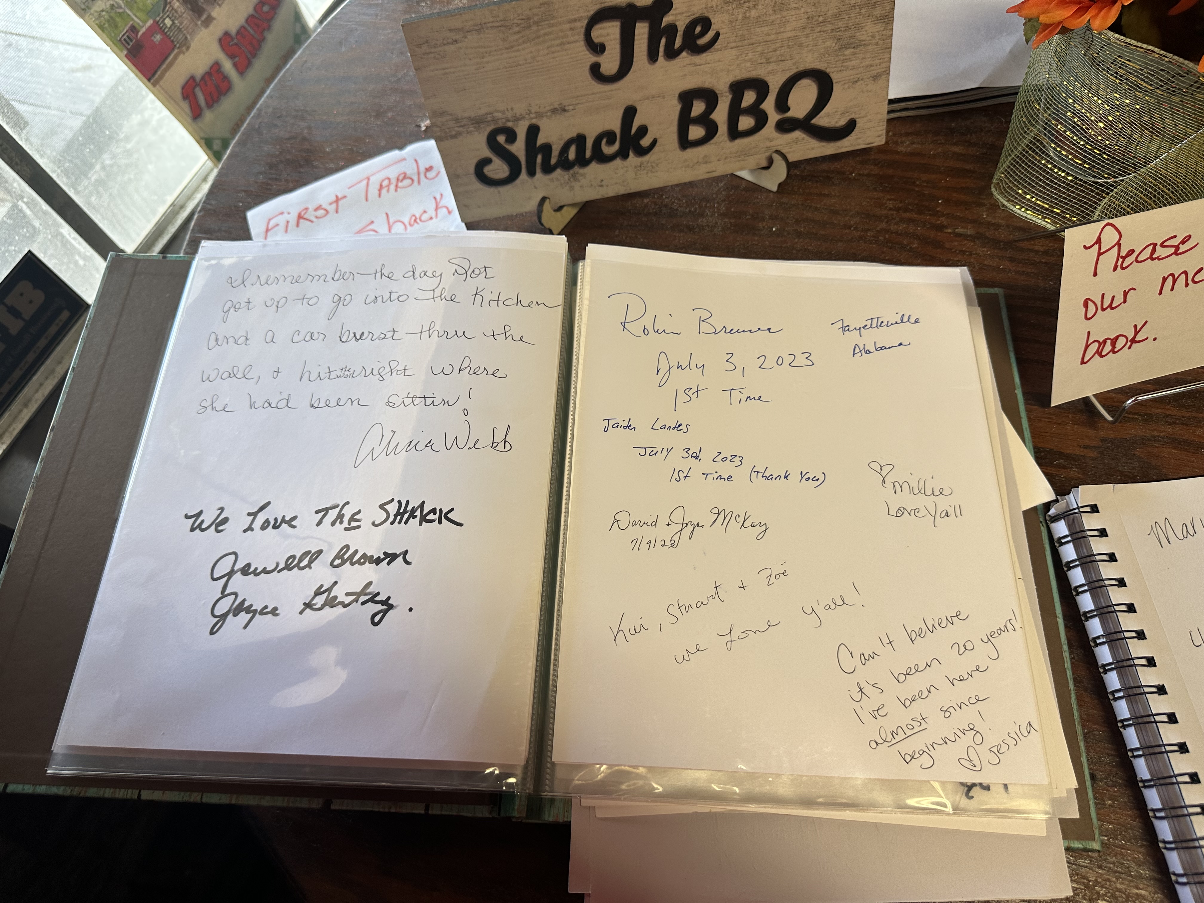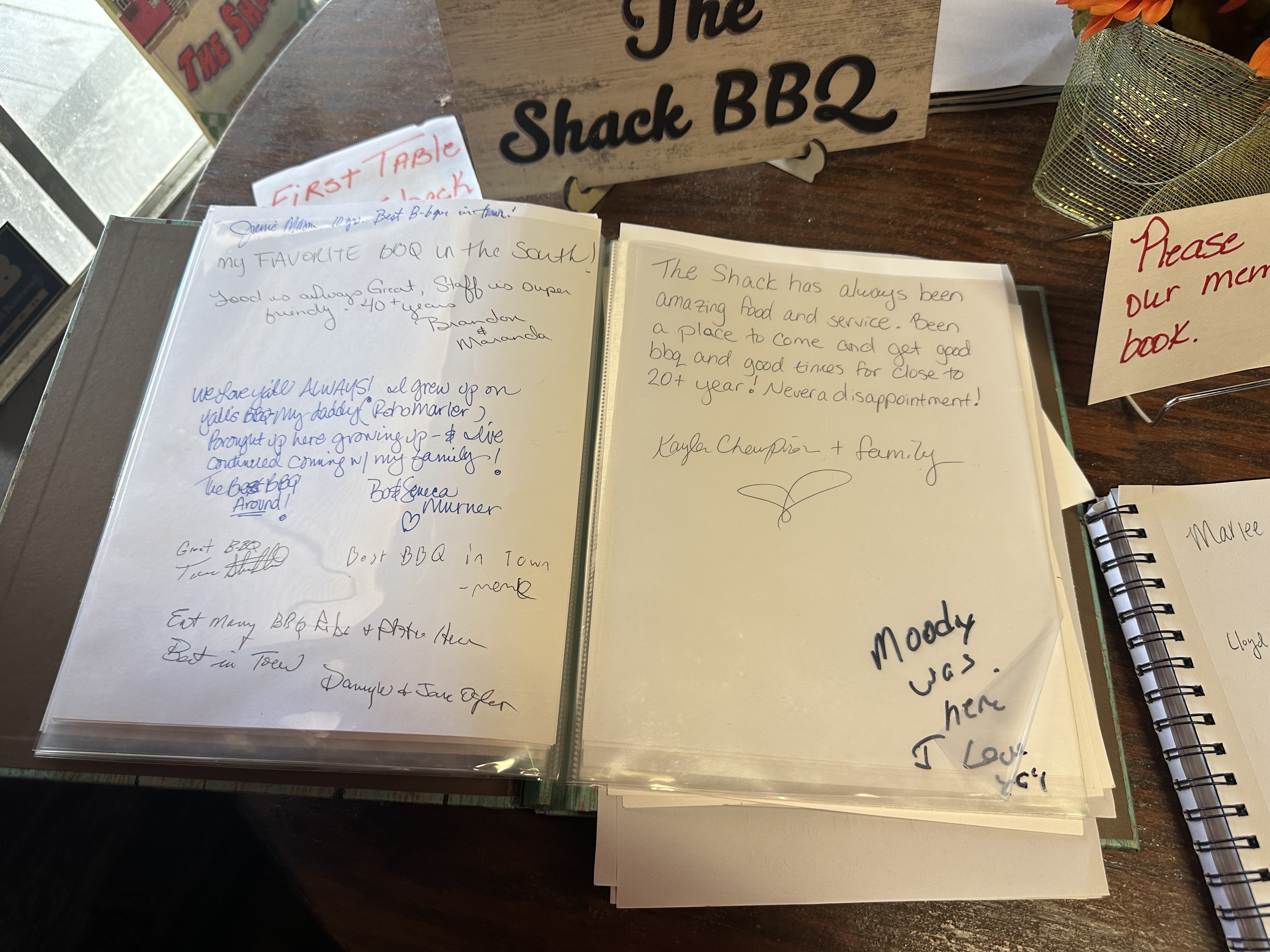 After we ate, and I took enough iPhone photos to satisfy my need to describe the place, I encountered a round table near the front door. There were a couple memory books. I signed and flipped through several past pages. I know they keep these memory books at Gatlinburg cabins and beach resorts, but finding one inside a forty-year-old barbecue joint was different in such a good way. I felt connected to a place I didn’t intend to visit.